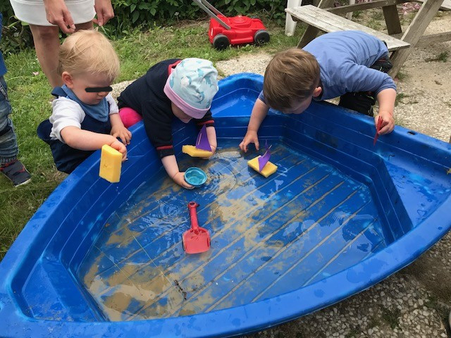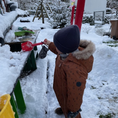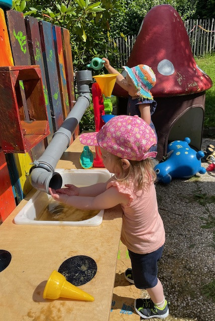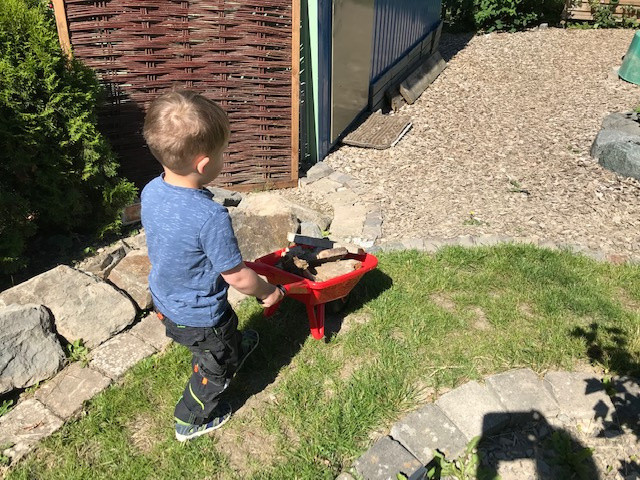 Auf der ca.20 qm² großen Terrasse direkt am Haus, haben die Kinder die Möglichkeit ihre Motorik und den Gleichgewichtssinn durch die Fortbewegung von Trampel- und Lauffahrzeugen zu erweitern und zu festigen.